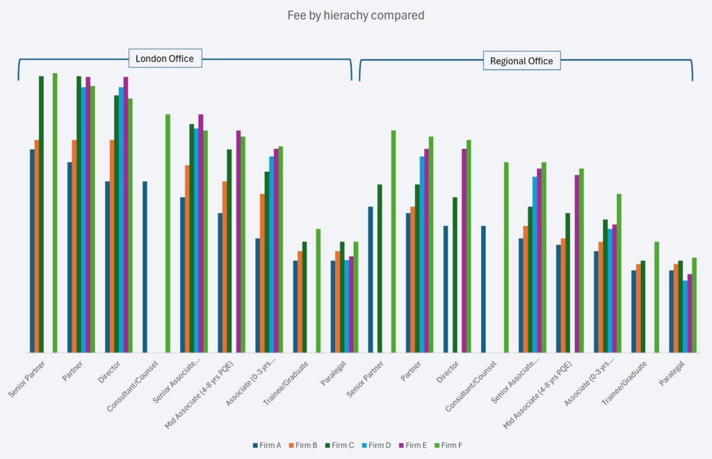Starting with the basics – comparing different firms rates by fee hierarchy. This is done by lines of business and then separated out into different offices, namely London and then regional.