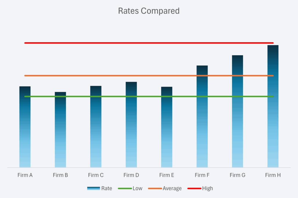 Whilst Firms A through E are all billing an average hourly fee below the market average, Firms F through H are comparatively high. Firm H is approaching the top rate found in the market.